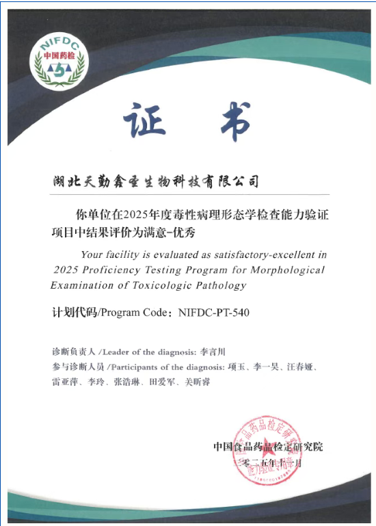 毒性病理形態(tài)學檢查是藥物臨床前毒理學評價的重要環(huán)節(jié)。為在毒性病理診斷領域持續(xù)保持高水平,天勤生物全資子公司湖北天勤鑫圣生物科技有限公司(以下稱“天勤鑫圣”)參加了由中國食品藥品檢定研究院組織的2025年度毒性病理形態(tài)學檢查能力驗證項目(NIFDC-PT-540),結果評價再次榮獲“優(yōu)秀”。