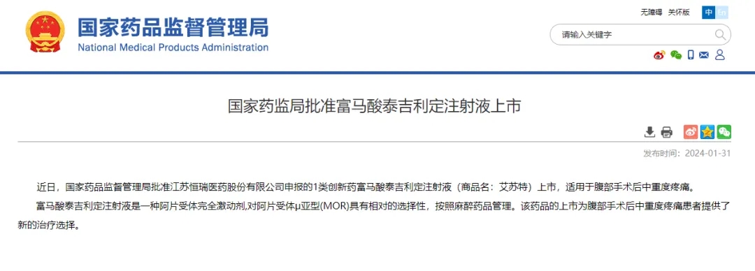 2024年1月31日,中國國家藥品監督管理局(NMPA)官網宣布批準恒瑞醫藥1類創新藥“富馬酸泰吉利定注射液”(商品名:艾蘇特)上市,適應癥為腹部手術后中重度疼痛。 湖北天勤生物科技股份有限公司(以下簡稱“天勤生物”)表示熱烈祝賀。天勤生物子公司湖北天勤鑫圣生物科技有限公司(以下簡稱“天勤鑫圣”)作為“富馬酸泰吉利定注射液”項目的合作伙伴,與恒瑞醫藥緊密配合,在3.5個月內完成了該品種關鍵代謝產物的重復給藥毒性試驗、生殖二段試驗和遺傳毒性試驗研究,為“富馬酸泰吉利定注射液”新藥的獲批上市提供了有力支持。 “富馬酸泰吉利定注射液”是一種阿片受體完全激動劑,對阿片受體μ亞型(MOR)具有相對的選擇性,按照麻醉藥品管理。研究數據顯示,該藥物不僅鎮痛效果顯著,起效速度快,能有效延緩術后疼痛反彈需補充鎮痛的時間;并且在保證鎮痛效果的同時,大幅降低了惡心、嘔吐和呼吸抑制等常見不良反應的發生率,極大地提升了患者的治療舒適度和安全性。 天勤生物祝賀“富馬酸泰吉利定注射液”順利獲批上市,該藥品的上市為腹部手術后中重度疼痛患者提供了新的治療選擇。同時,天勤生物將不斷探索和...